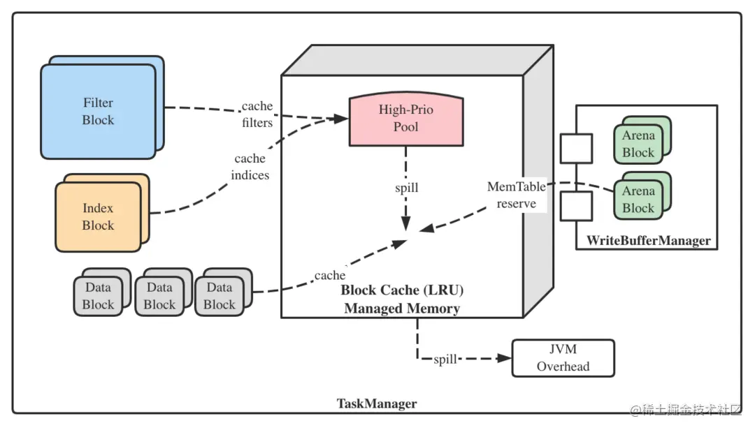 托管内存机制默认启用(state. backend. rocksdb. memory. managed = true),此时TM会将整块Managed Memory区域作为所有RocksDB实例共用的BlockCache,并通过WriteBufferManager将MemTable的内存消耗向BlockCache记账(即写入只有size信息的dummy块),从而BlockCache能够感知到全部的内存使用并施加限制,避免OOM发生。SST索引和Bloom Filter块则会进入BlockCache的高优先级区。需要注意,由于历史原因以及Iterator-pinned Blocks的存在,BlockCache在少数情况下不能严格限制内存,故有必要配置一些JVM Overhead作为兜底。