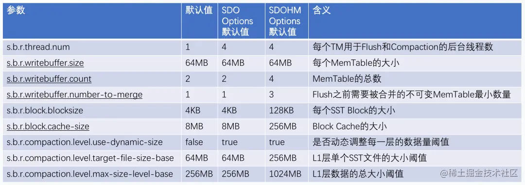 除了上述参数之外,原则上建议遵循RocksDB Wiki的忠告("No need to tune it unless you see an obvious performance problem"),不再手动调整RocksDB高级参数(如s.b.r.{block | writebuffer | compaction}.*),除非出现了托管内存机制无法解决的问题。笔者也将部分高级参数列出如下,供参考。