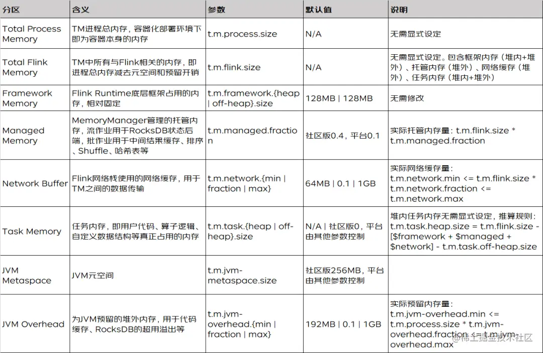 下面来看图说话,分区域给出比官方文档详细一些的介绍。t.m.即为taskmanager. memory.前缀的缩写。