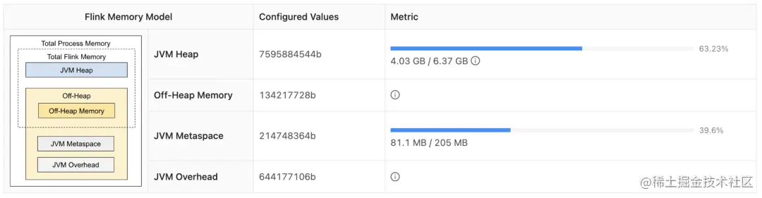 下面以在生产环境某作业中运行的8C / 16G TaskManager为例,根据以上规则,手动计算各个内存分区的配额。注意有部分参数未采用默认值。