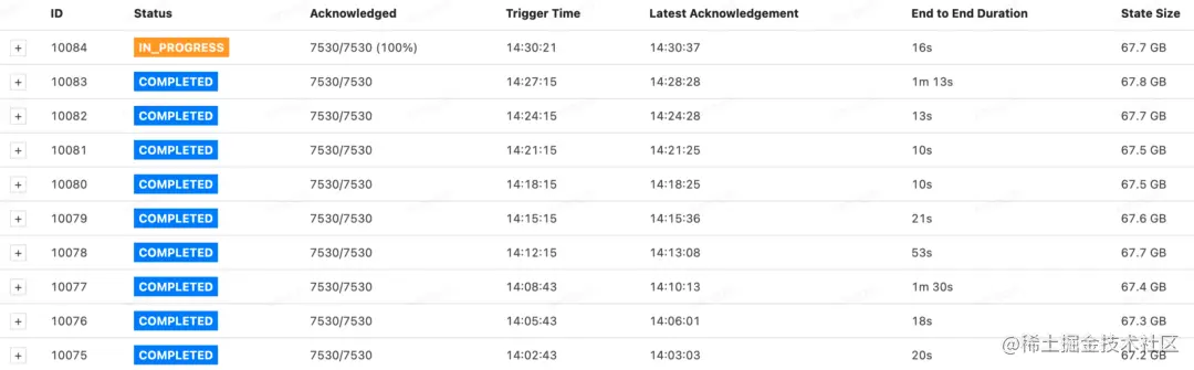 另外,在大状态作业中碰到一种常见的现象,即Checkpoint全部ack之后卡在IN_PROGRESS,经过1~3分钟左右才会变成COMPLETED,如下图所示。