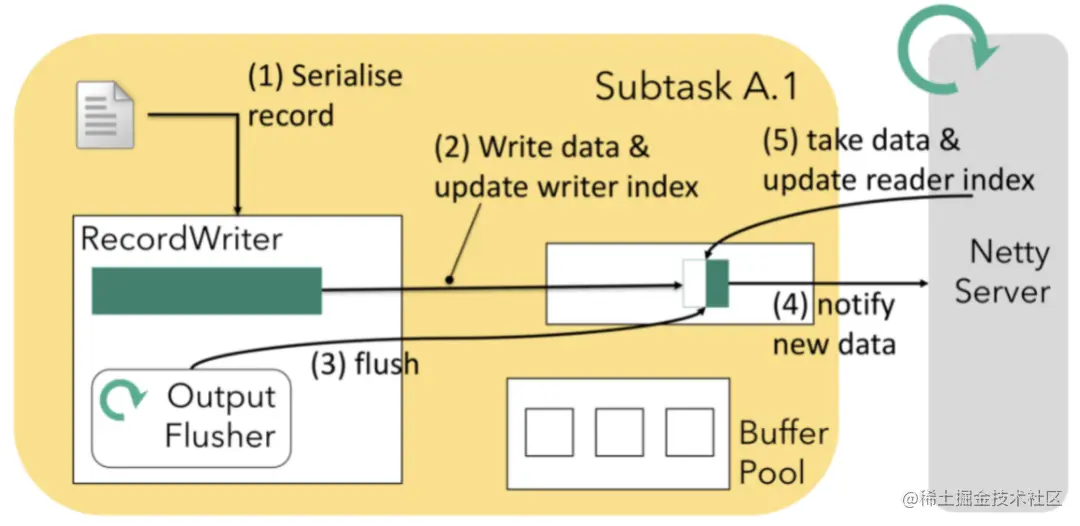 多说一句,上图这套机制也是Flink实现Credit-based流控(反压)的基础,想想诊断反压时会看的**PoolUsage参数就明白了。反压是比较基础的话题,这里就不再展开。