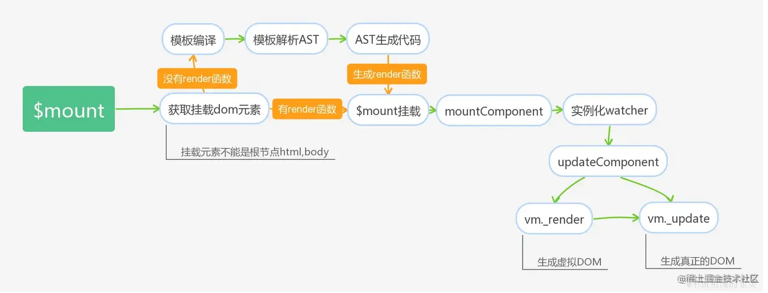 Vue挂载的流程是比较复杂的,接下来我将通过流程图,代码分析两种方式为大家展示挂载的真实过程。