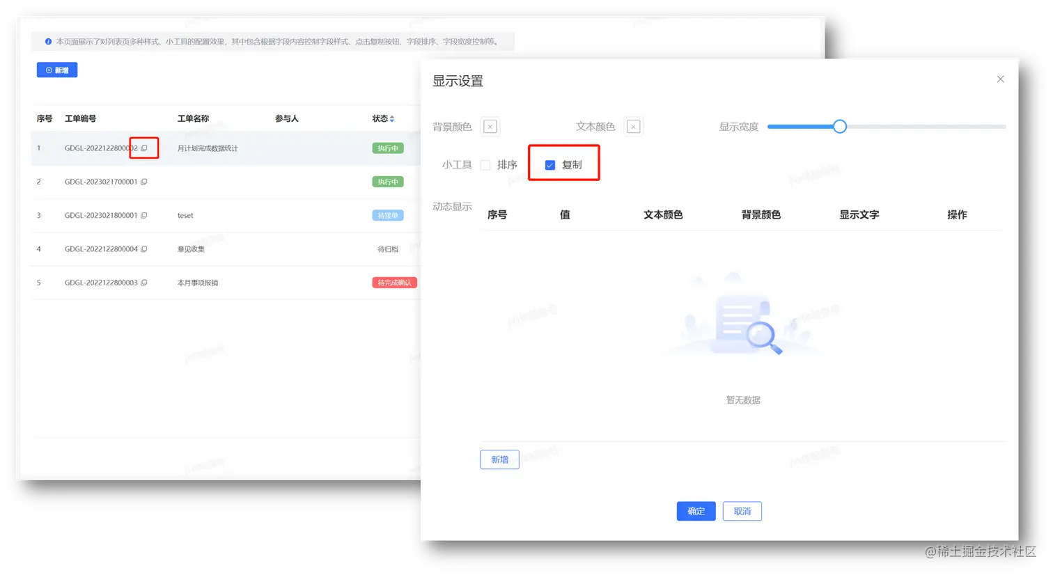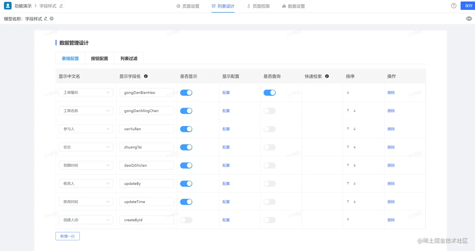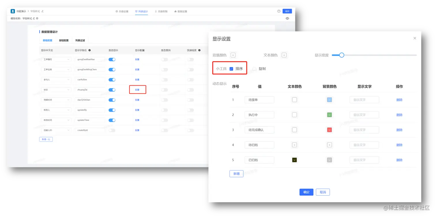 2、增加排序控制配置,在显示配置项中,勾选排序,即可实现列表上的排序功能。