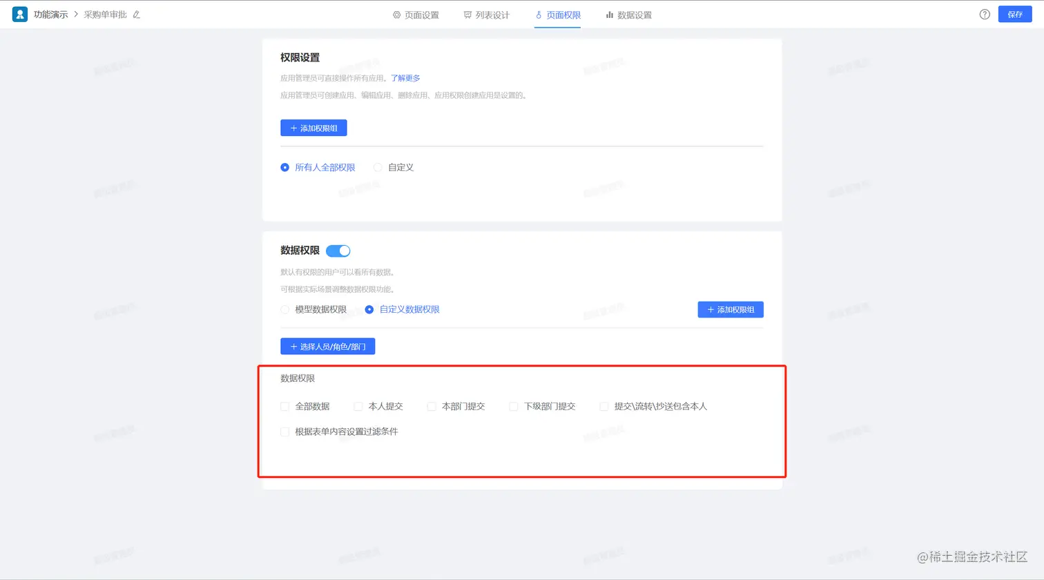7、支持同一数据模型在不同列表页上的不同数据权限控制。