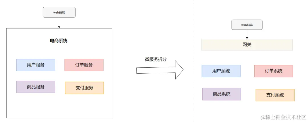 所谓的微服务拆分,其实就是把一个单体的应用,按功能单一性,拆分为多个服务模块。比如一个电商系统,拆分为用户系统、订单系统、商品系统等等。