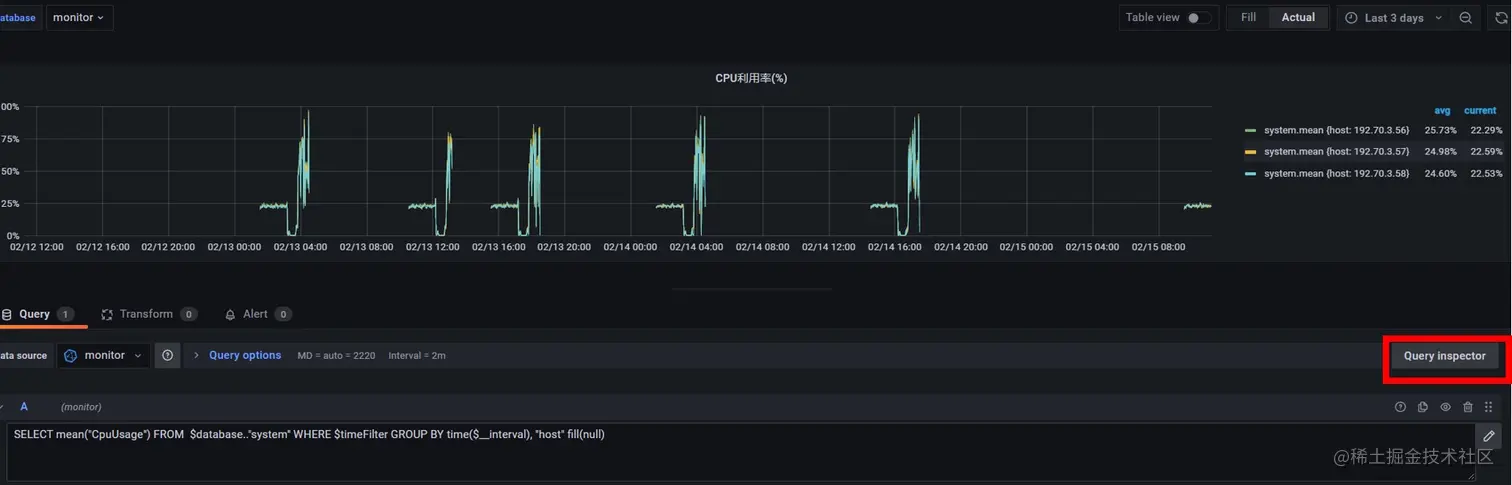除了使用图形化界面查询,也可以点击“Query Inspector”来使用直接输入查询语句的方式建立Panel。如下图所示,先选择数据源为刚才建立的“monitor”,然后可以通过查询语句“SELECT mean("CpuUsage") FROM timeFilter GROUP BY time($__interval), "host" fill(null)”来查询数据库中cpu的平均使用率。