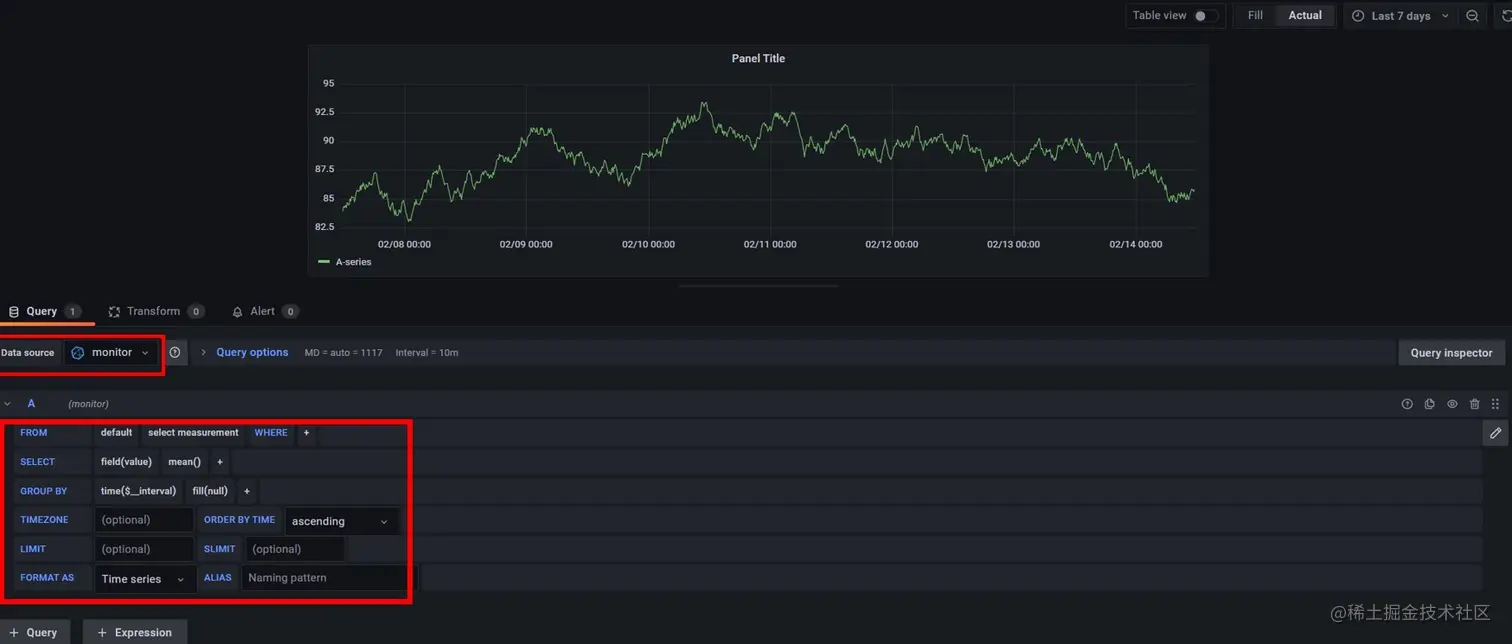 数据源创建完成后可以在Grafana中新建看板来完成监控用户感兴趣的内容,如下图所示,建立一个Panel,选择Data source为刚刚建立的monitor,然后通过图形化查询选择界面来建立看板的查询语句。