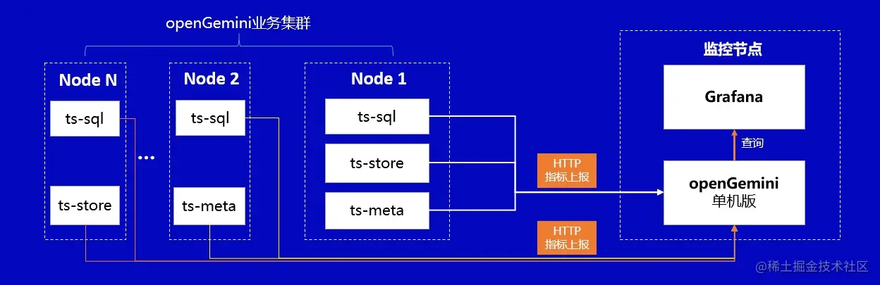 openGemini 集群: 随着业务运行,openGemini持续输出内核运行状态的各项指标数据。openGemini同时支持两种方式输出指标数据,第一种将指标数据输出到日志中;第二种则为HTTP方式,采用openGemini的数据格式,接收端需使用InfluxDB或openGemini这两种数据库均可。