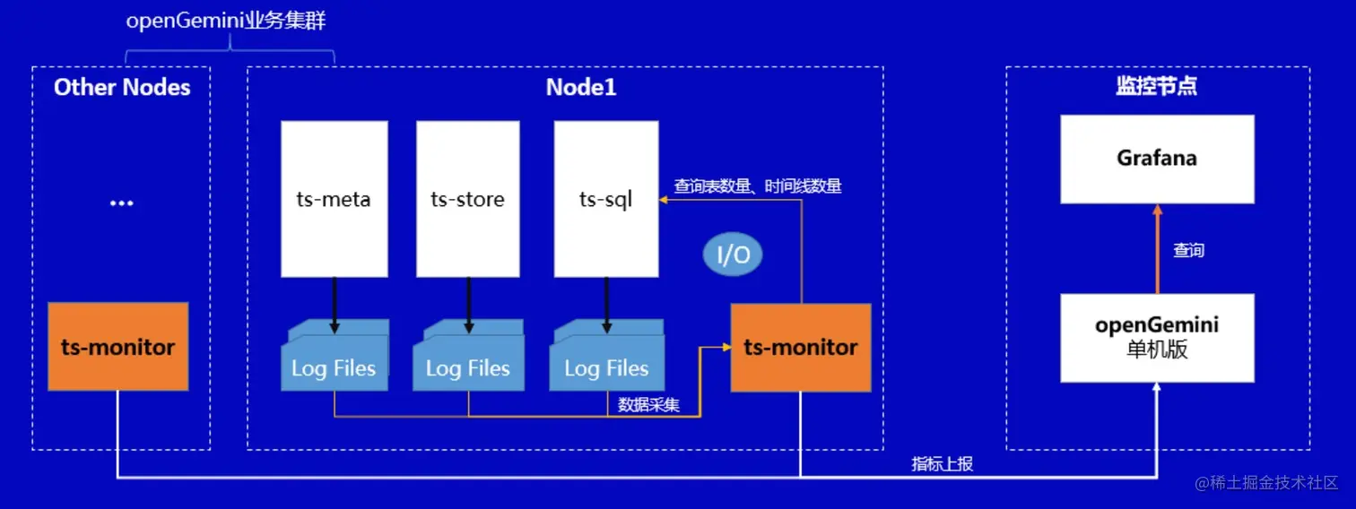 如图所示,监控数据以log files方式输出的方式需要在业务集群的每个节点中部署一个ts-monitor,用来从该节点上所有openGemini组件产生的监控日志中采集监控指标数据,然后将数据写入到远端监控节点上的openGemini中,最后使用Grafana作为监控/告警面板来读取单机版openGemini中的监控数据。