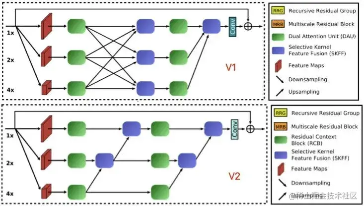 对于没有看过MIRNetV1的同学来说,直接看MIRNetV2的话,可能不知道MIRNetV2的改进点在哪里。在这里,我们对两者的差异进行简单的汇总(可参考上图),主要体现在两个方面: