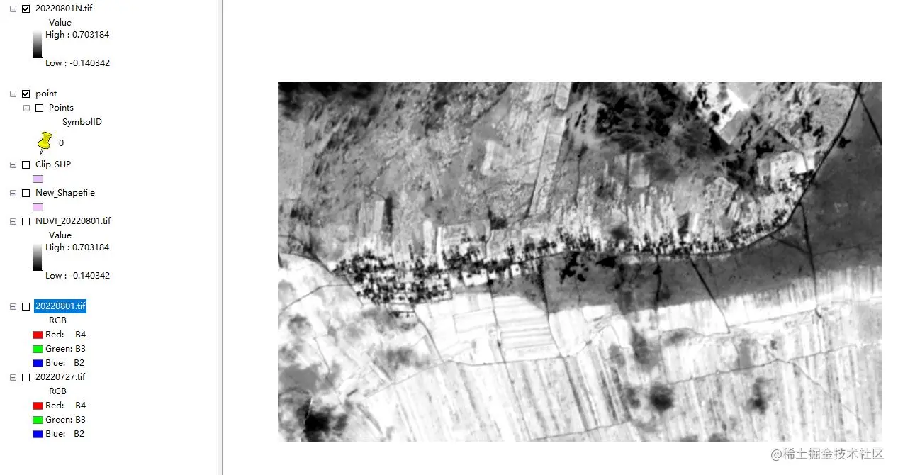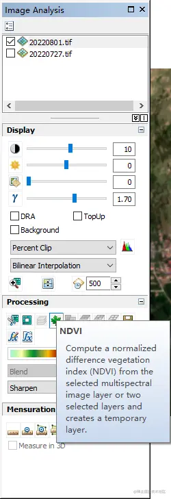 如果大家是基于单一波段的栅格图像来计算NDVI,那么直接将这两个波段对应的图层选中,配置上述两个勾选框,并直接进行后续操作即可。