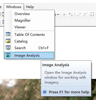 首先,将我们需要计算NDVI的栅格图层添加到ArcMap软件中,并在ArcMap软件的顶部菜单栏中,选择“Windows”→“Image Analysis”选项。