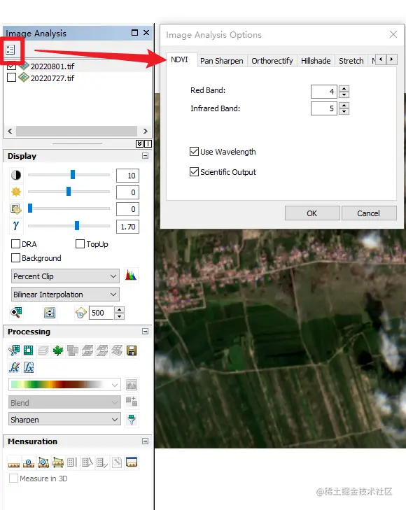 随后,“Use Wavelength”勾选框若选中,表示如果当前栅格图像的信息中包含了每一个波段的波长信息,那么软件将自动尝试基于波段的波长,自行确定哪个是红波段、哪个是近红外波段,并自动将二者进行计算(即就不一定按照前面填的“Red Band”与“Infrared Band”来计算了);“Scientific Output”勾选框则表示在自动计算NDVI时,软件将使用“波段计算”函数还是NDVI函数。这里若将“Scientific Output”勾选框选中,采用“波段计算”函数计算NDVI;“波段计算”函数就是直接计算NDVI数值,其结果是在-1到1这个范围内的,即标准的NDVI取值;而若取消勾选,将采用NDVI函数计算NDVI,其在计算完毕后会将结果拉伸至0 - 200的范围,从而方便图层的色彩渲染。建议这里将“Scientific Output”勾选框选中,因为个人感觉0 - 200的NDVI范围不是很直观。