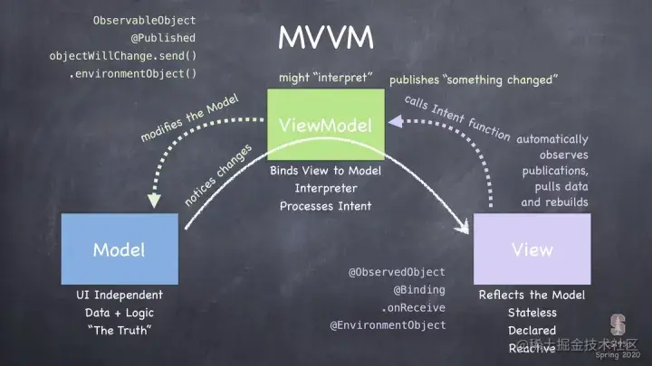 MVVM 可以说几乎就是一个 MVC,不过通过 View Model 层来将数据和视图进行绑定。熟悉iOS开发的小伙伴都知道,iOS的 Cocoa 框架都是基于 MVC 设计的,关于 MVC,我们可以看下斯坦福的 CS193p Paul这张经典图