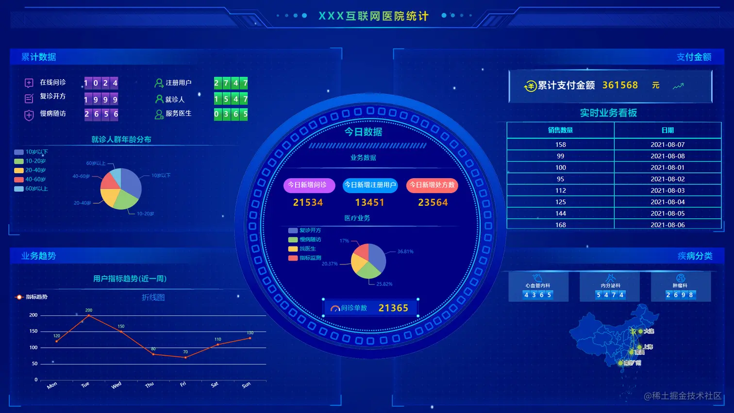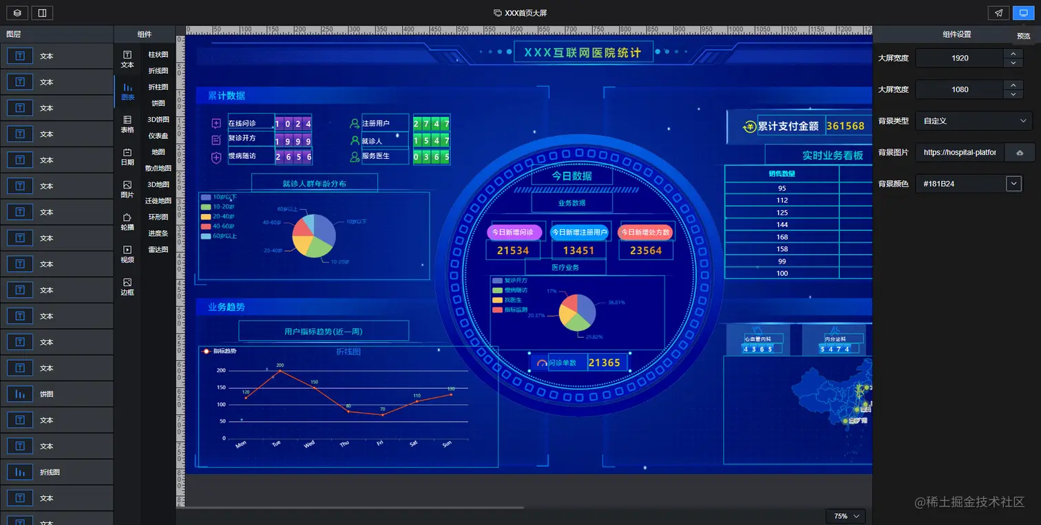 - 大屏组件包括文本,柱状图,折线图,折柱图,饼图,3d饼图,仪表盘,地图,散点地图,3d地图,迁徙地图,进度条,雷达图,表格,日期,图片,轮播组件,视频等18个组件,并且地图和部分组件支持下钻,还提供一些边框和背景图的素材,组件虽然提供的不多,但是样式调整简单易上手。相信作者以后也会持续更新组件,丰富组件。