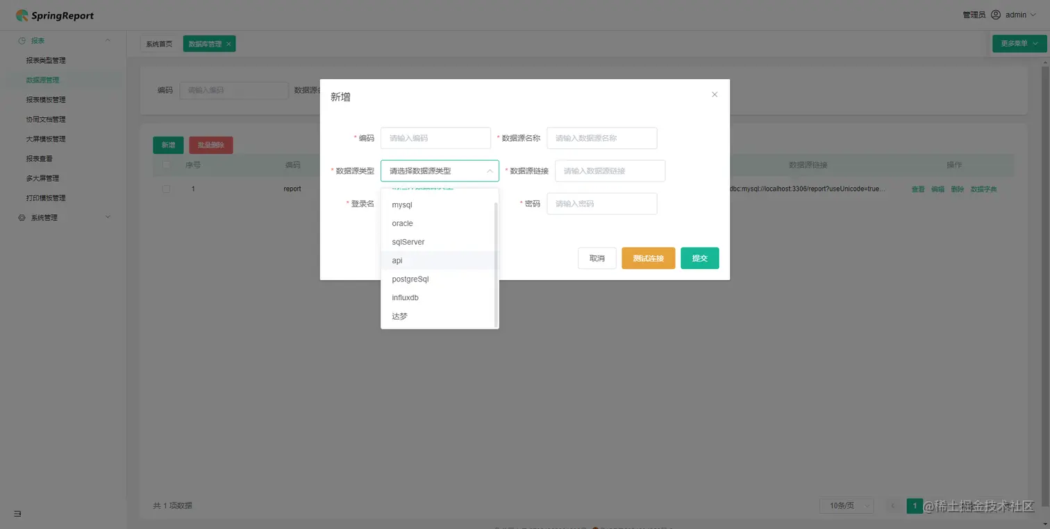 - 数据源支持七种:mysql,oracle,sqlServer,api,postgresql,influxdb,达梦数据库