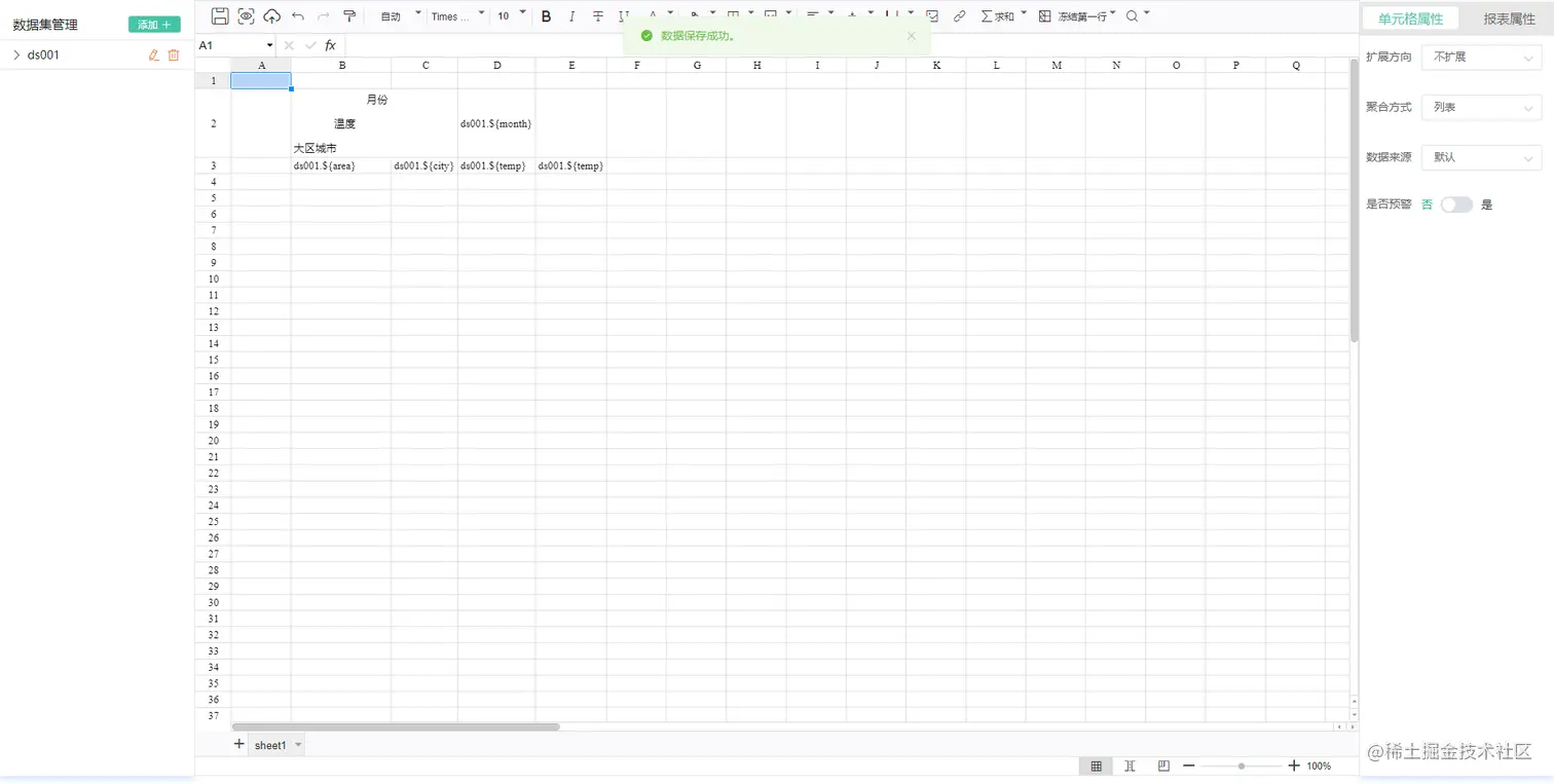- 报表支持数据上报功能,可以将单元格的数据与数据源中的表字段进行绑定,实现数据的上报功能。