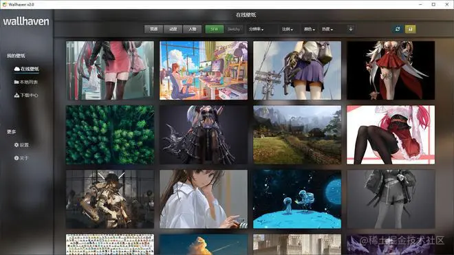 WallHaven想必很多人都知道,一个超好用的壁纸网站,最近有大佬自己研发出了电脑软件版本。安装之后打开就能看到WallHaven网站中的同步壁纸,壁纸加载速度快,可以筛选分辨率、按热度查看等等,有喜欢的直接就可以下载到本地了。