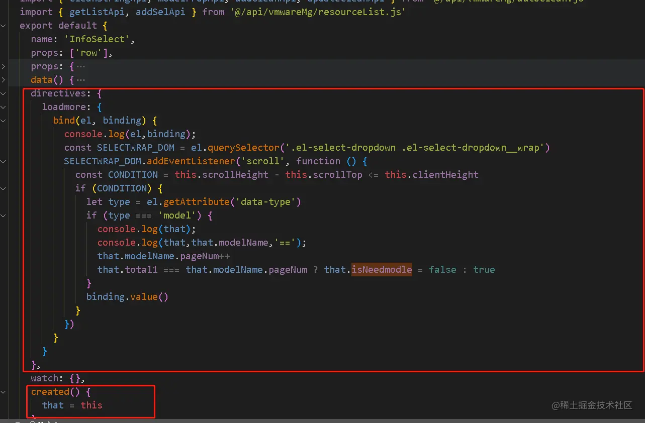 directives: { loadmore: { bind(el, binding) { console.log(el,binding); const SELECTWRAP_DOM = el.querySelector('.el-select-dropdown .el-select-dropdown__wrap') SELECTWRAP_DOM.addEventListener('scroll', function () { const CONDITION = this.scrollHeight - this.scrollTop <= this.clientHeight if (CONDITION) { let type = el.getAttribute('data-type') if (type === 'model') { console.log(that); console.log(that,that.modelName,'=='); that.modelName.pageNum++ that.total1 === that.modelName.pageNum ? that.isNeedmodle = false : true } binding.value() } }) } } },methods 方法哩
