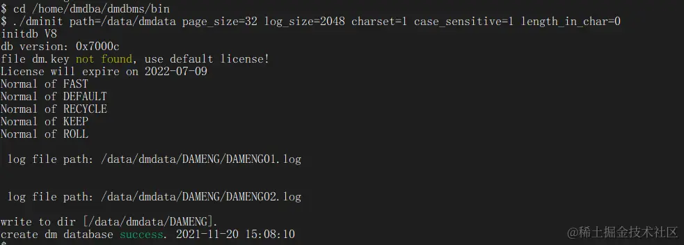./dminit path=/data/dmdata page_size=32 log_size=2048 charset=1 case_sensitive=1 length_in_char=0