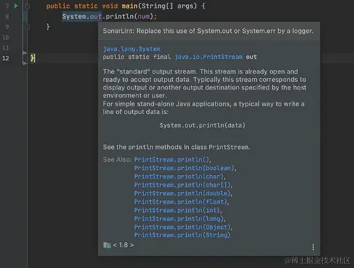 会按照阿里Java开发手册上规范帮我们检查代码,然后对代码做不同颜色展示,鼠标放上去,会看到提示内容,帮助开发者写出更规范的代码。