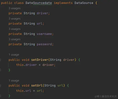 自己写的driver、url、name、password,需提供set方法,set注入