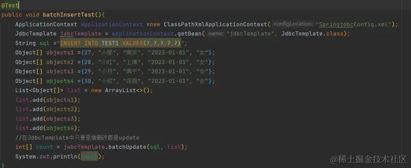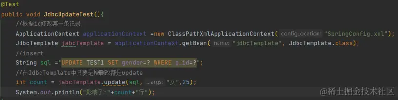 int update = jabcTemplate.update(sql, 26, "李四", "南京", "2023-01-01", "女");