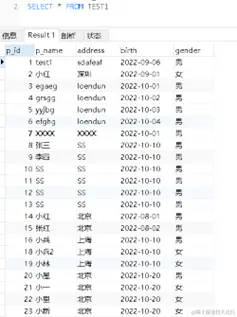 String sql ="SELECT p_id,p_name,address,birth,gender FROM TEST1 ";