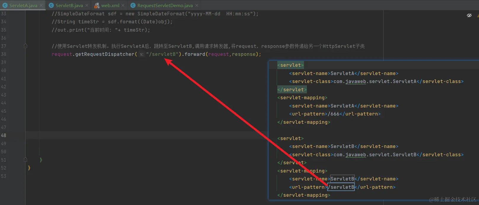 request.getRequestDispatcher("/servletB").forward(request,response);