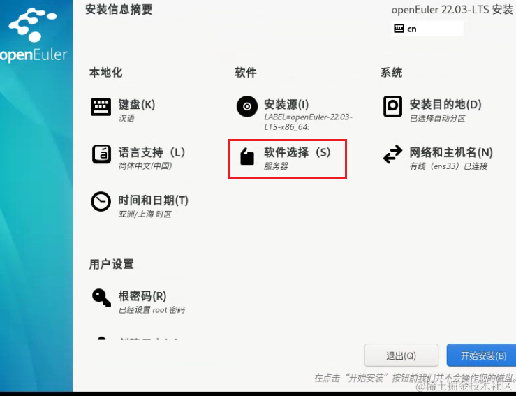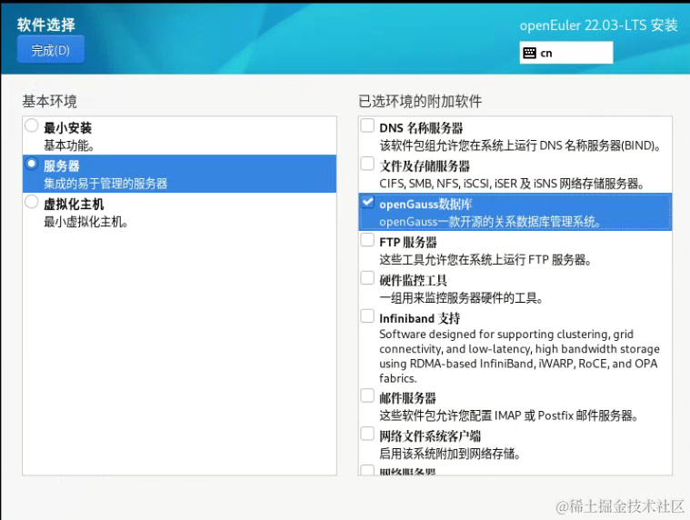 #openEuler 22.03 LTS ISO镜像安装操作系统时,安装引导界面的选择软件包里面勾选上openGauss Server,在安装完成操作系统后,默认安装上openGauss数据库并启动单机数据库进程。