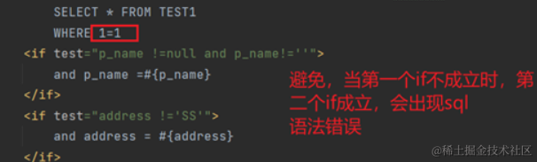 <if test="使用参数java对象的属性值作为判断条件,语法规则 属性=xx">