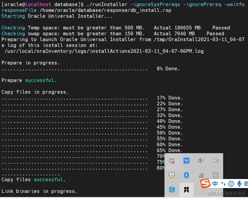 ./runInstaller -ignoreSysPrereqs -ignorePrereq -waitforcompletion \ -showProgress -silent -responseFile /home/oracle/database/response/db_install.rsp