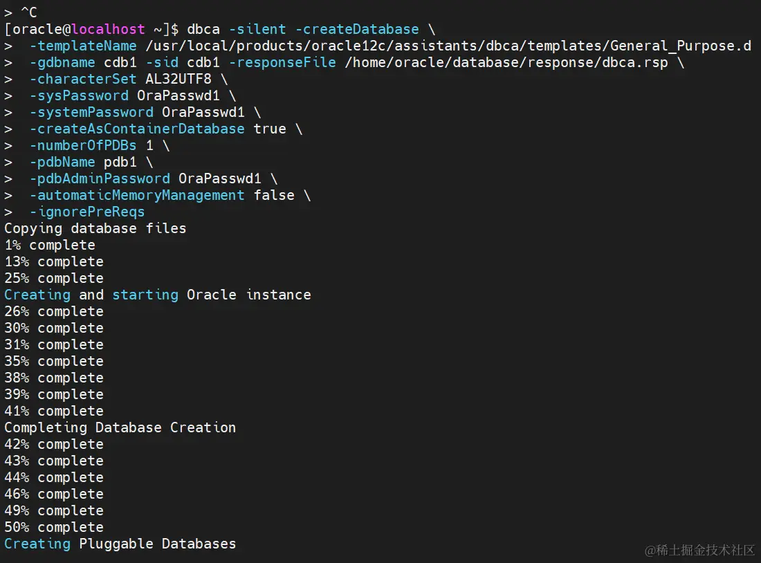 -gdbname cdb1 -sid cdb1 -responseFile /home/oracle/database/response/dbca.rsp \