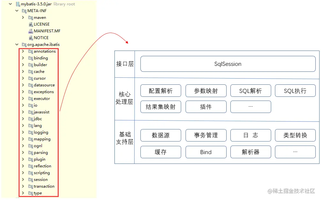 1.根据Mybatis源码,将其抽象为三层:基础支持层,核心处理层和接口层
