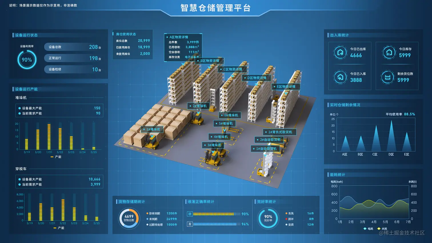今天给大家分享一个基于 数维图 的 Sovit3D可视化编辑器 构建的物流仓储3D可视化场景案例——智慧仓储物流三维可视化运维管理系统。通过二维组态,三维仿真形态的方式展现出仓储中心整条流水线的全场景作业情况,高精度还原仓库场景,覆盖建筑、货架、货物、设备等,建立以数据为依据的智能运维模式,通过快速高效的分析、呈现处理,降低运营成本。