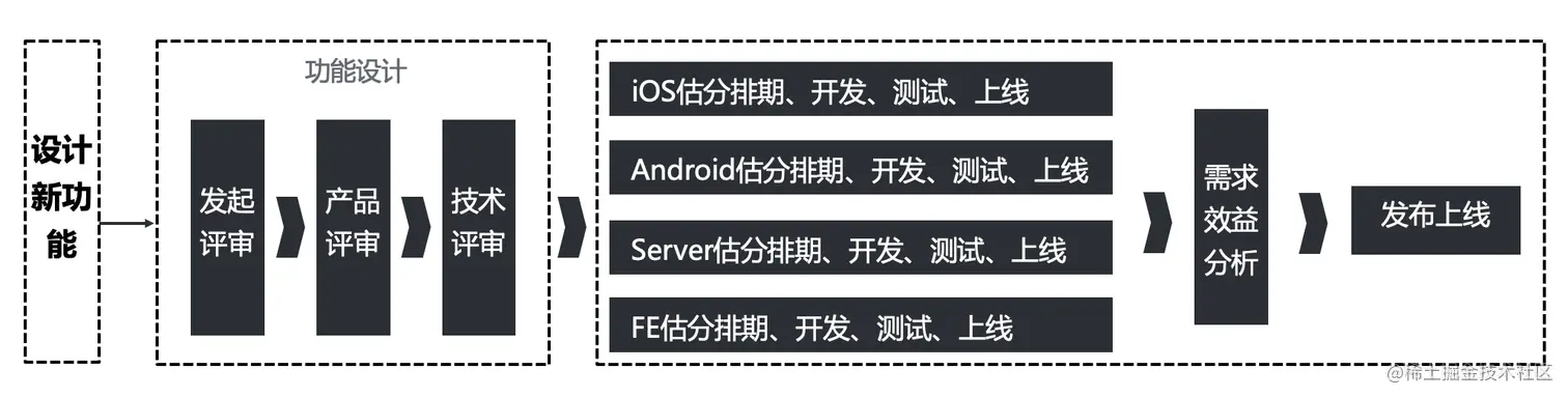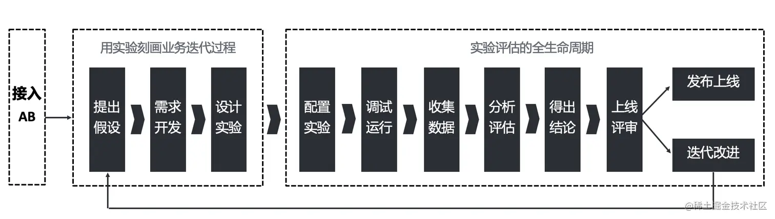 而字节内部的产品新功能研发流程则会在常规的基础研发流程中,额外嵌入两个环节:埋点设计与 A/B 实验方案设计。
