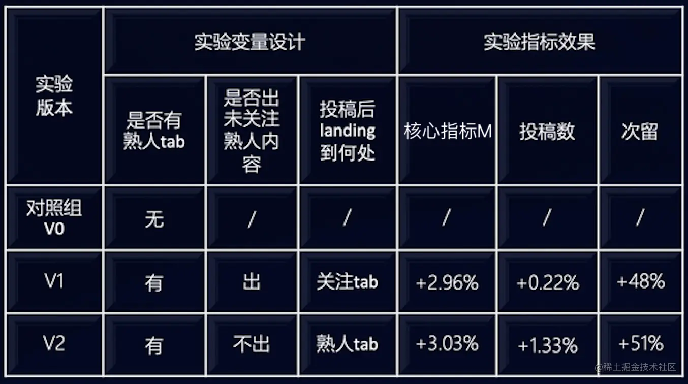 在上述提到的例子中,DataTester 的实验结果显示 V2 组试验指标各项均更为优秀,说明新增“熟人 Tab”对比其他方案而言能对抖音价值有更为明显的提升,那么后续在产品迭代中,会考虑全量上线这个产品优化策略。