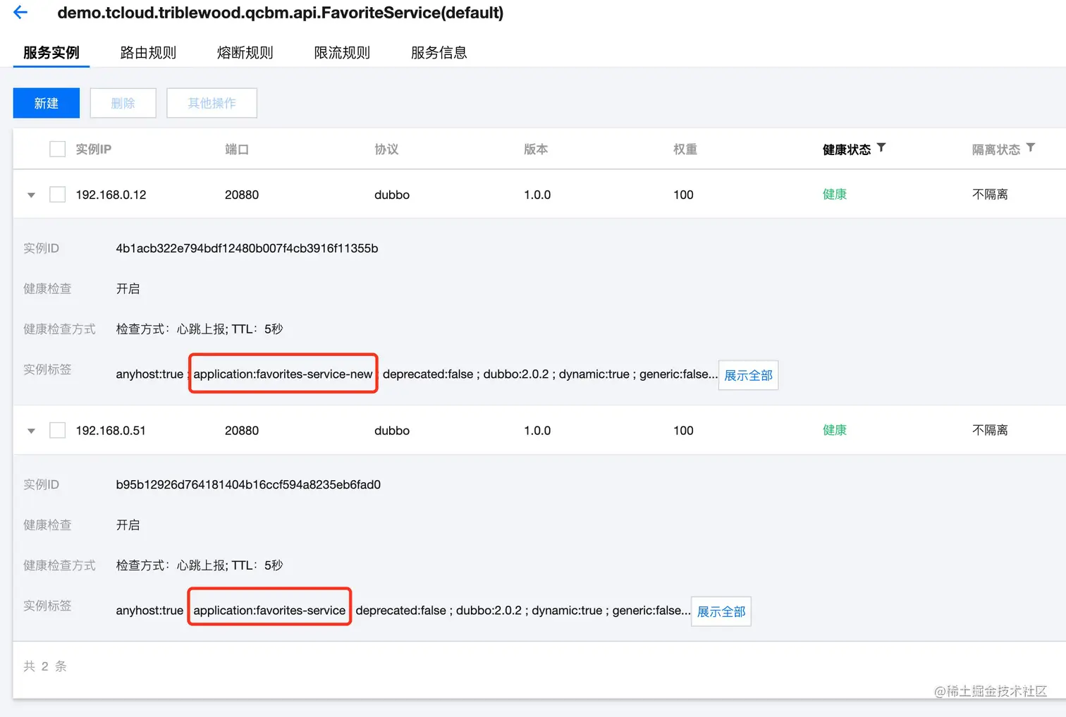 实例打标,指的是通过实例标签标识不同的应用,将基线版本与灰度版本区分开。一般有两种方式进行实例打标:一是框架自动同步,将应用名,环境变量等做为实例标签;二是用 K8S 部署时的 CRD Label 作为实例标签。本实践中使用 Dubbo 框架里的 applicaiton 字段来区分基线版本和灰度版本应用。
