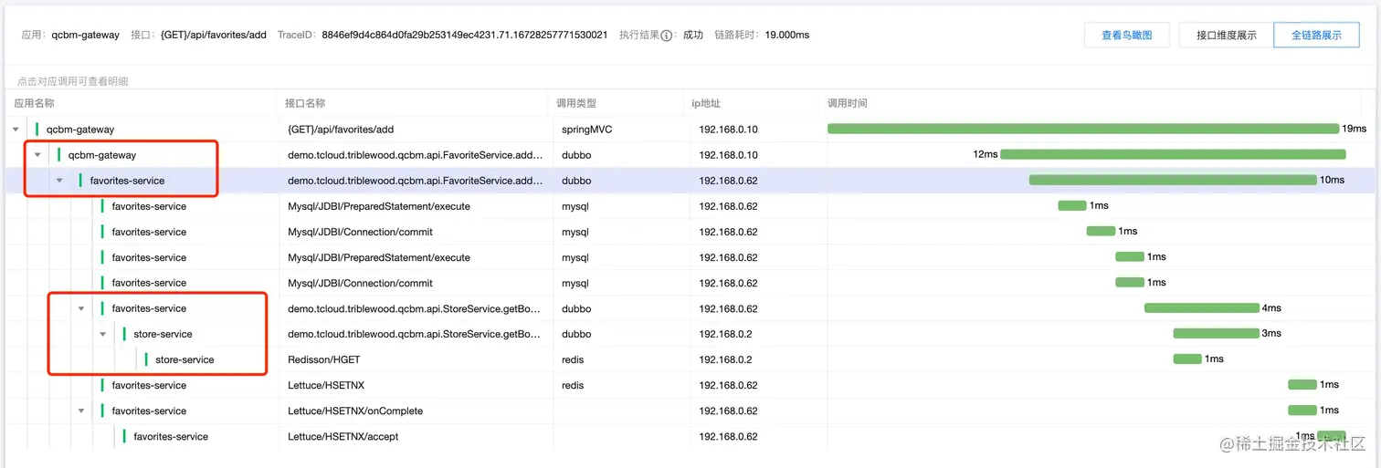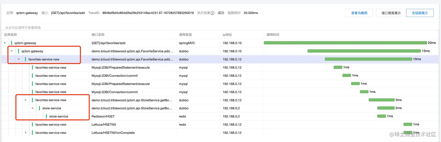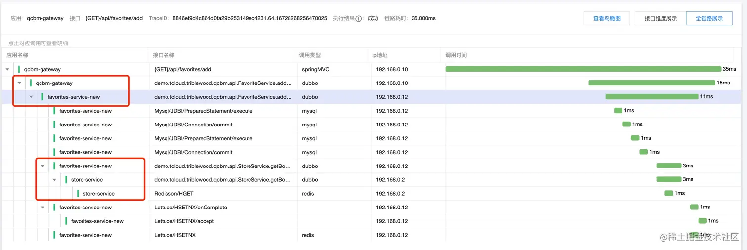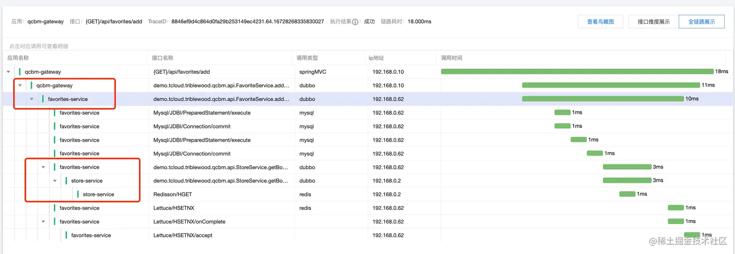 同时,也可以通过链路监控观察到,gateway-service(基线服务)正确的请求到 favorite-service-new(灰度服务),同时 favorite-service-new 正确请求到 store-service(基线服务):