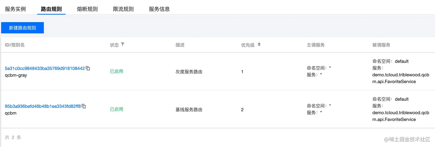 我们创建了2条服务间动态路由规则,基线和灰度请求按照不同匹配规则,路由至对应实例分组。实现中,北极星基于请求消息内容来对请求匹配,并根据优先级进行流量调度。