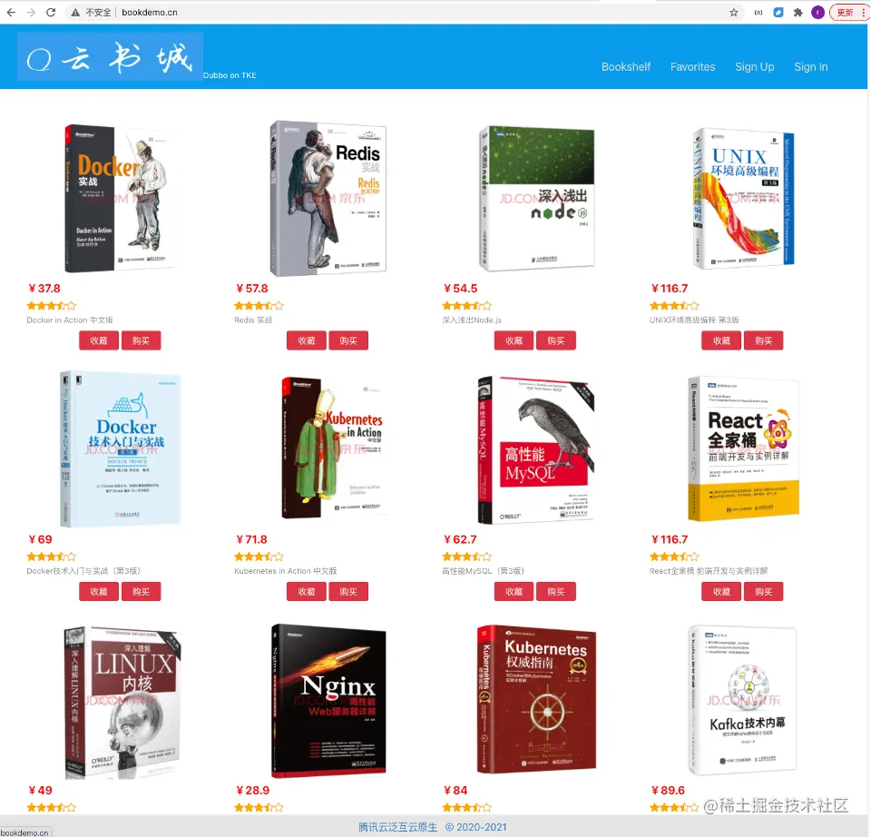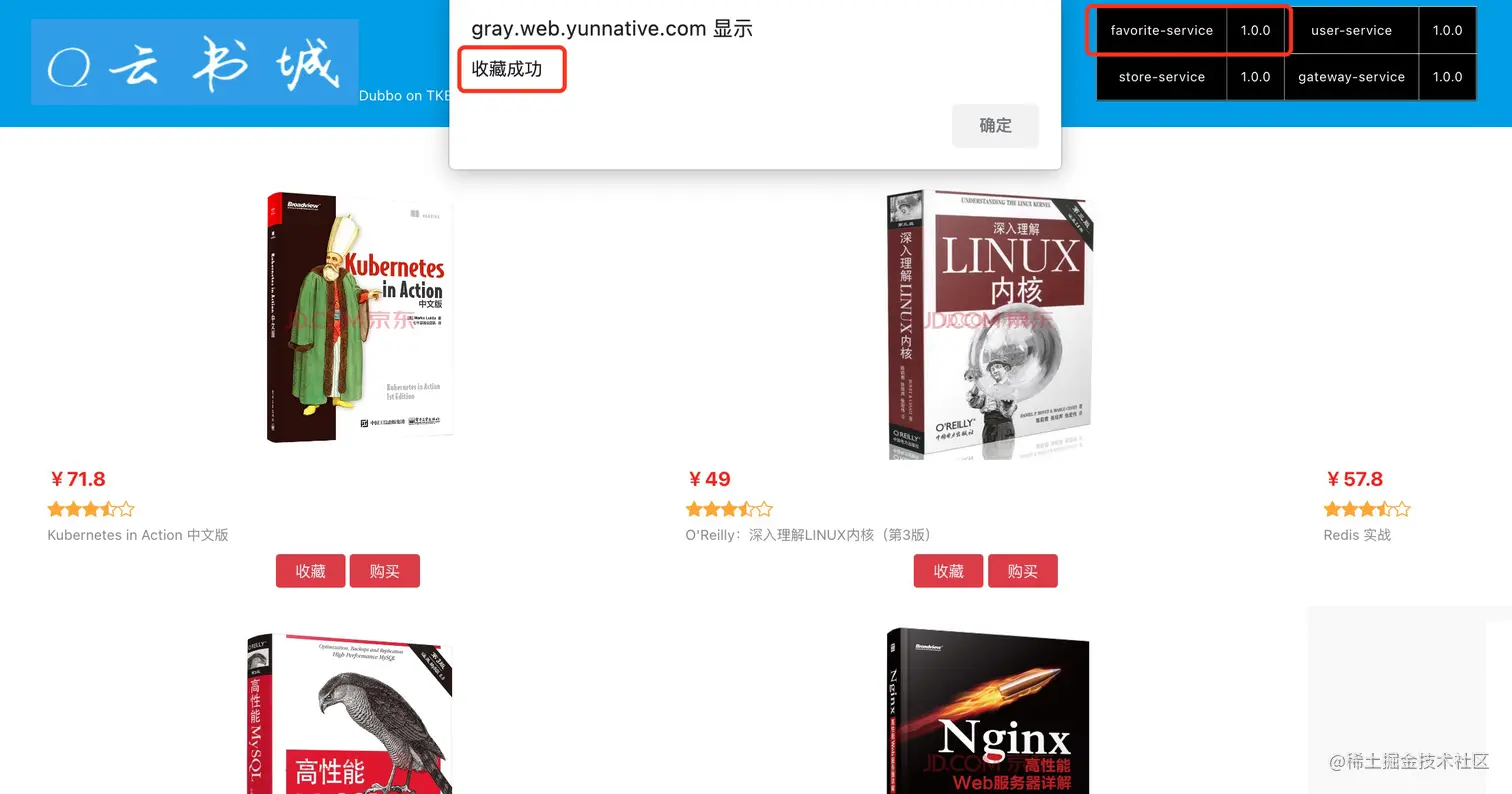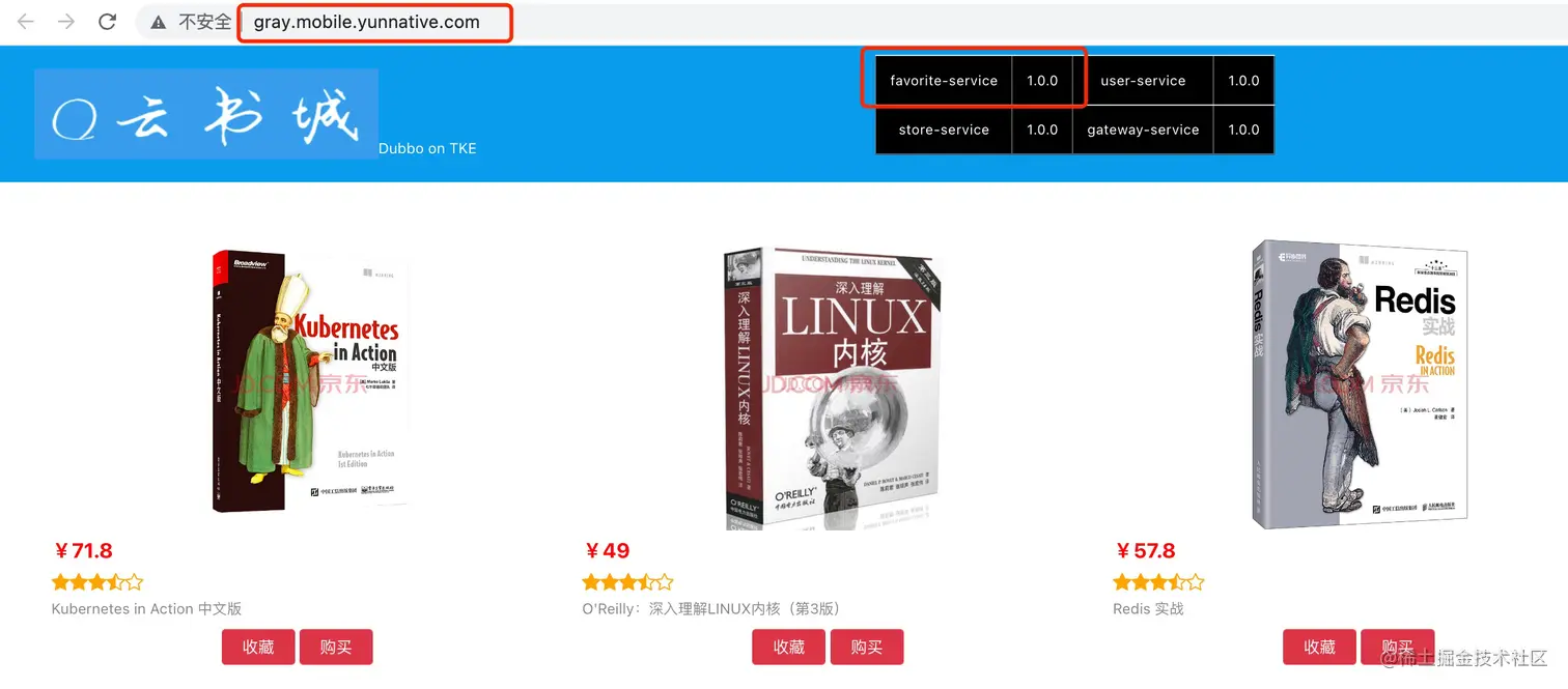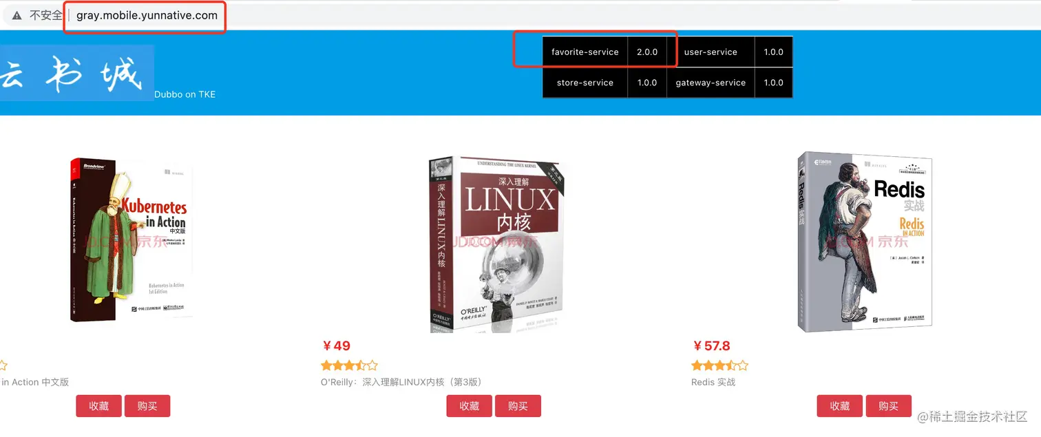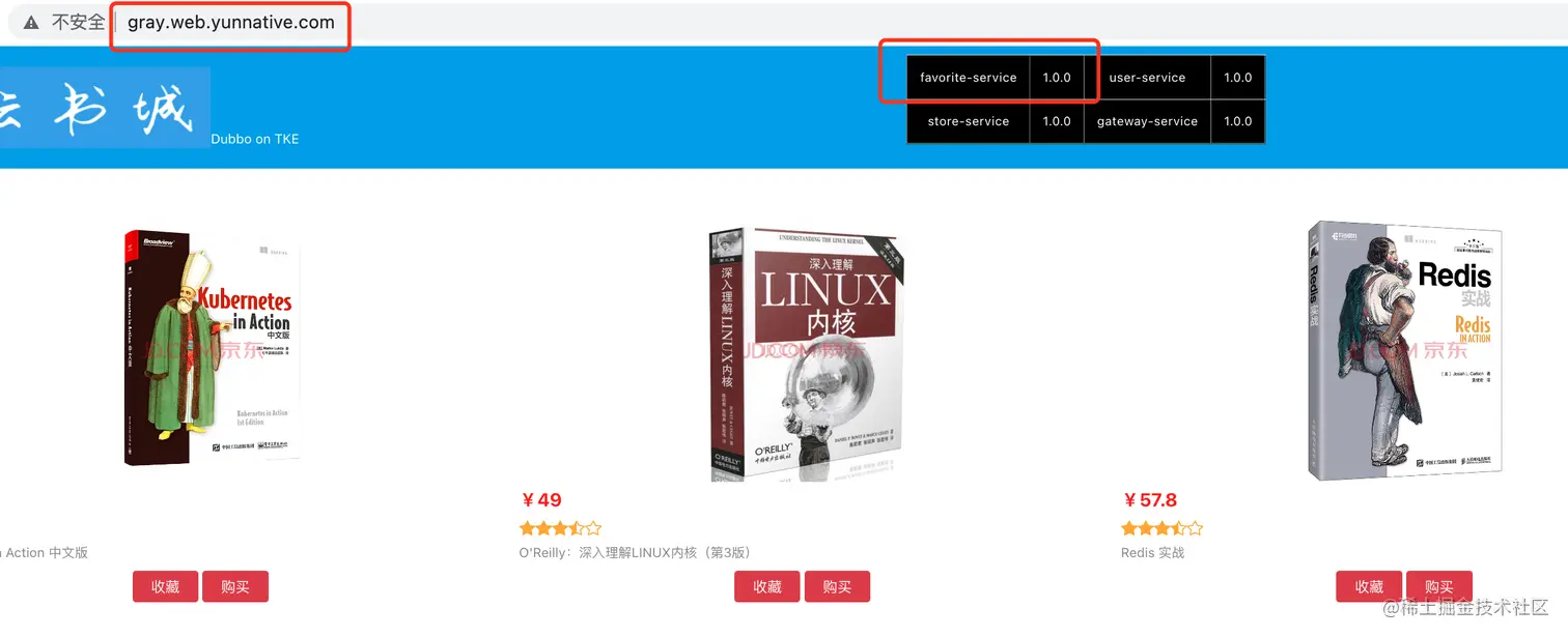 接下来演示云原生 API 网关+北极星网格构建的全链路灰度发布能力。下图模拟的云书城应用,由4个后端的微服务组成,采用 Spring Boot + Dubbo 实现,调用链包含:收藏功能、购买功能,用户管理功能和订单功能。用户通过前端页面访问书城,进行内容浏览和书籍下单。