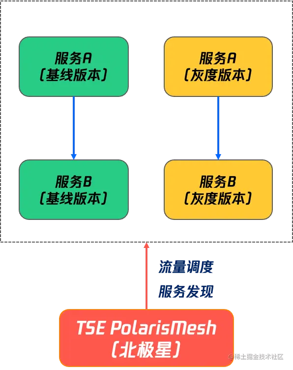 北极星网格在全链路灰度中,充当服务治理中心的角色,解决架构中注册发现、故障容错、流量控制和安全问题。通过北极星网格控制台中的配置,把基线和灰度请求,路由到不同的实例分组上,并将灰度请求固定在灰度版本服务间进行传递和处理。