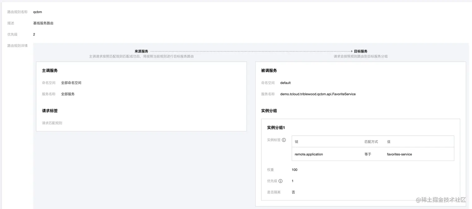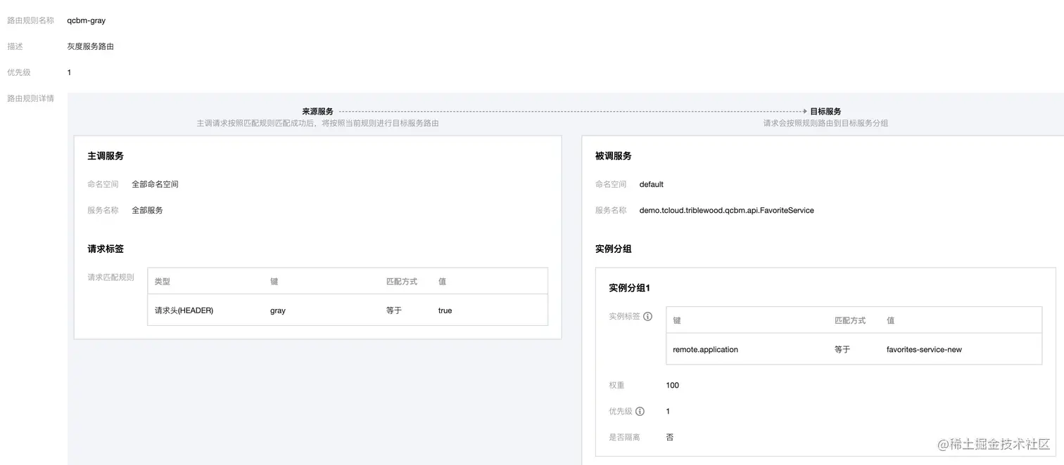 qcbm-front-router-mobile 路由规则的请求到达 Dubbo-Gateway 后,一旦需要访问收藏服务(FavoriteService),gray:true 染色标签会命中北极星网格灰度服务路由,选择调用 remote.application为favorites-service-new 的服务实例。此实例分组为我们部署的 favorites-service-new 灰度版本 deployment。