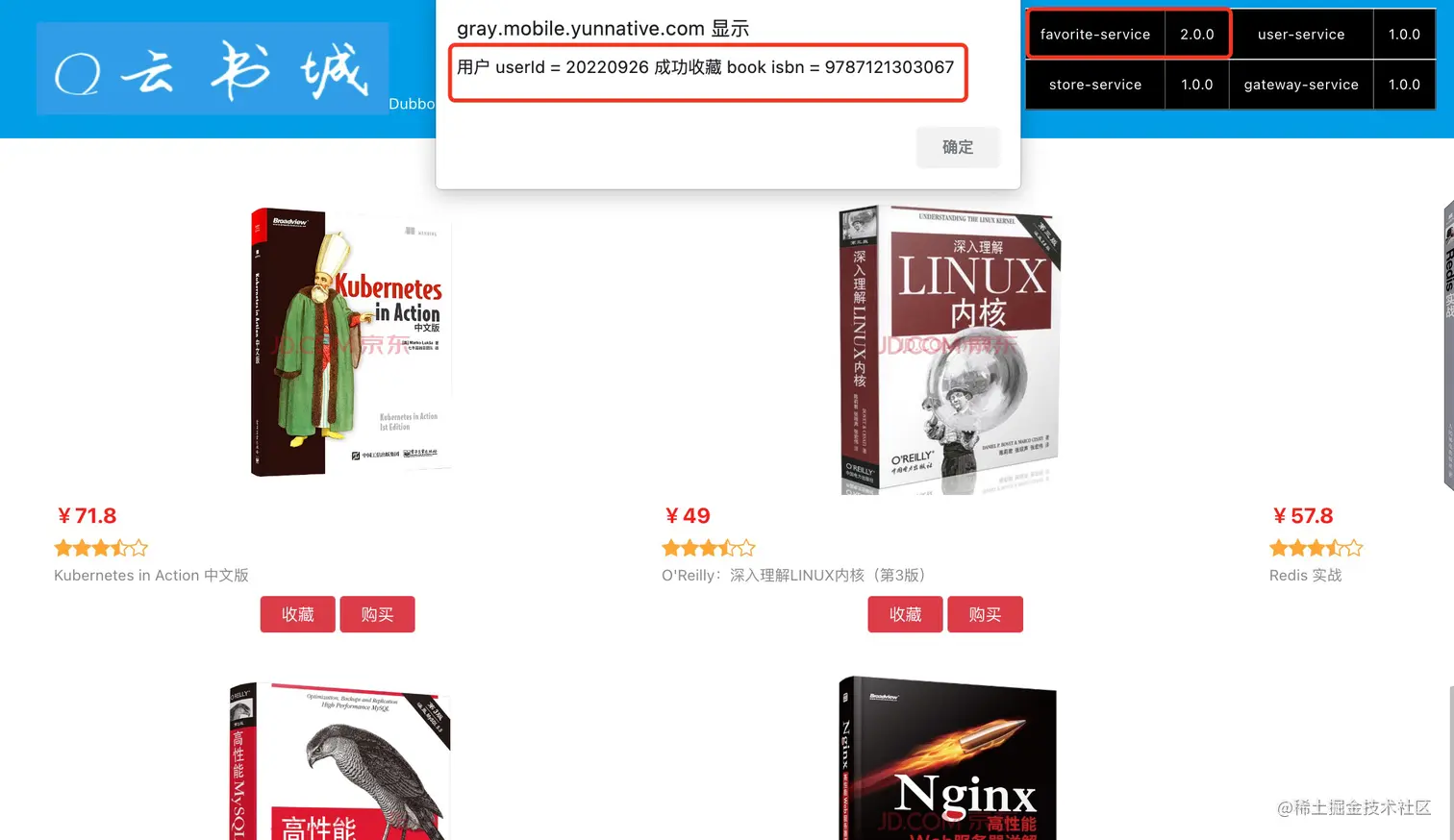 灰度版本修改后,页面点击【收藏】,会详细显示用户 ID 及书籍 ID,代码示例如下: