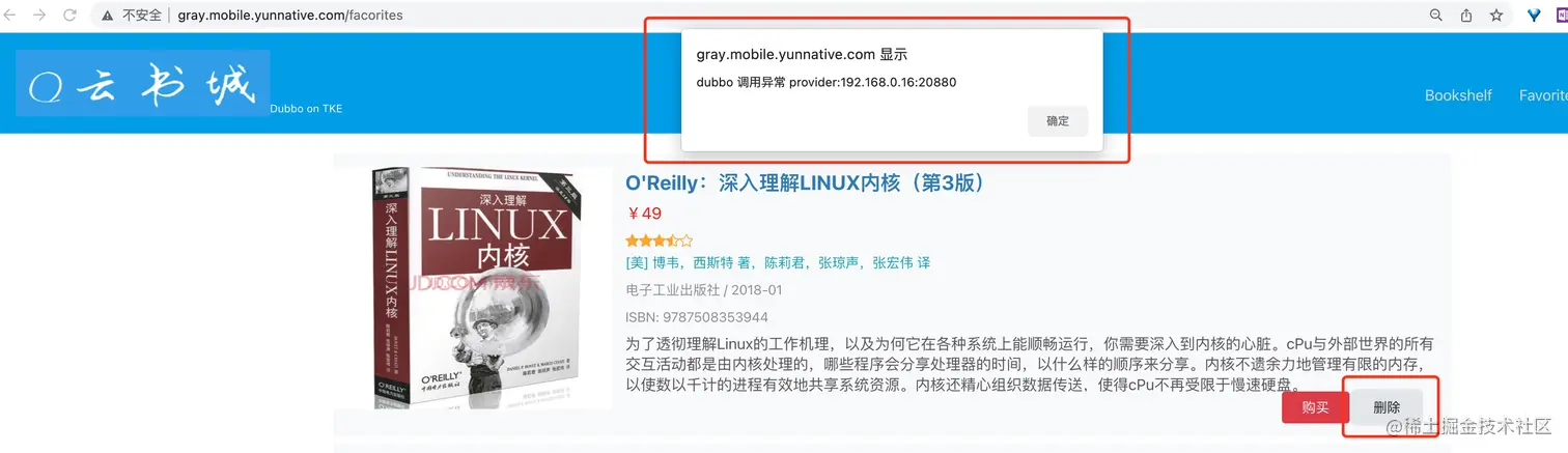 部署一个新的“故障“收藏服务,Dubbo 程序延用 application=favorites-service-new 标签(为区分应用,这里故障灰度服务命名为 Favorites-Service-New-Bad),保证原路由规则可用。该“故障”程序修改了收藏服务的 delUserFavoriteBook 接口代码,当访问时直接抛出异常,模拟服务故障。代码如下所示: