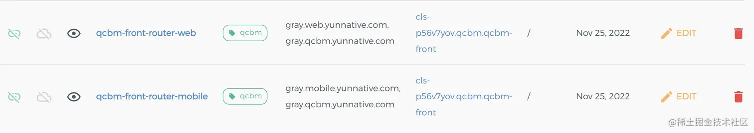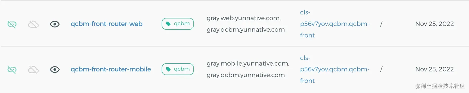 ● qcbm-front-router-web,HOST为gray.qcbm.yunnative.com,Header为app:web,路由到Dubbo-Gateway服务