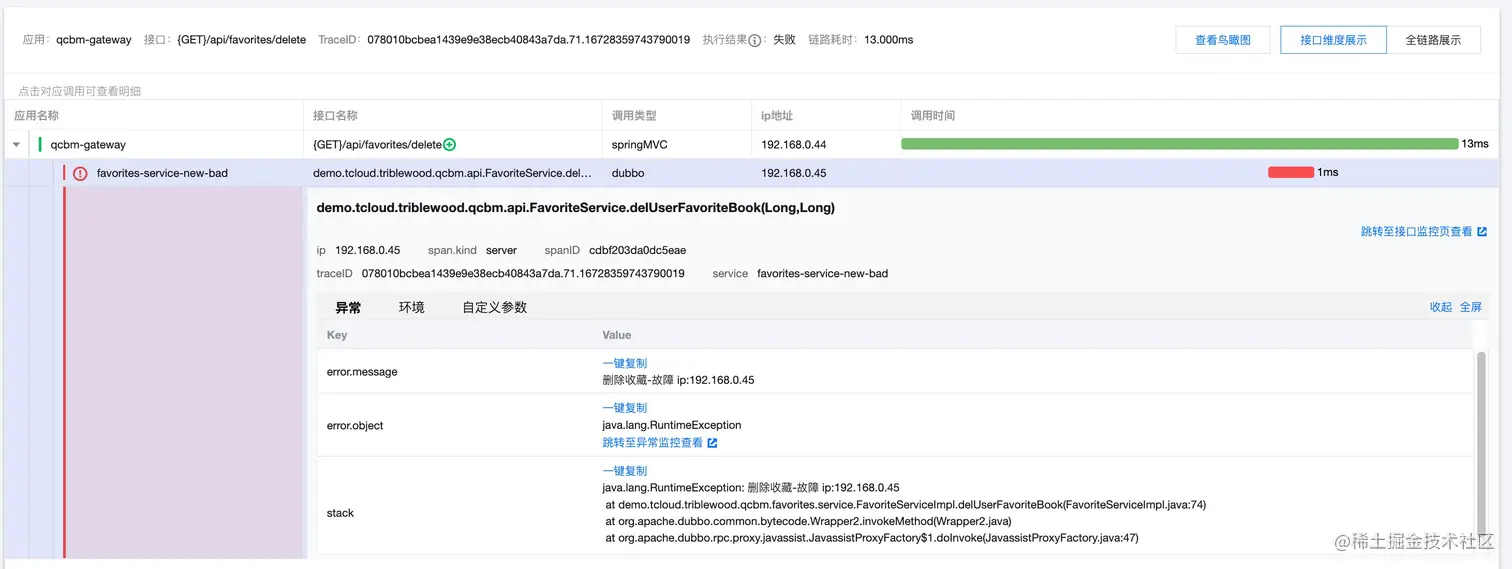 通过链路追踪,也可以查看到服务异常。