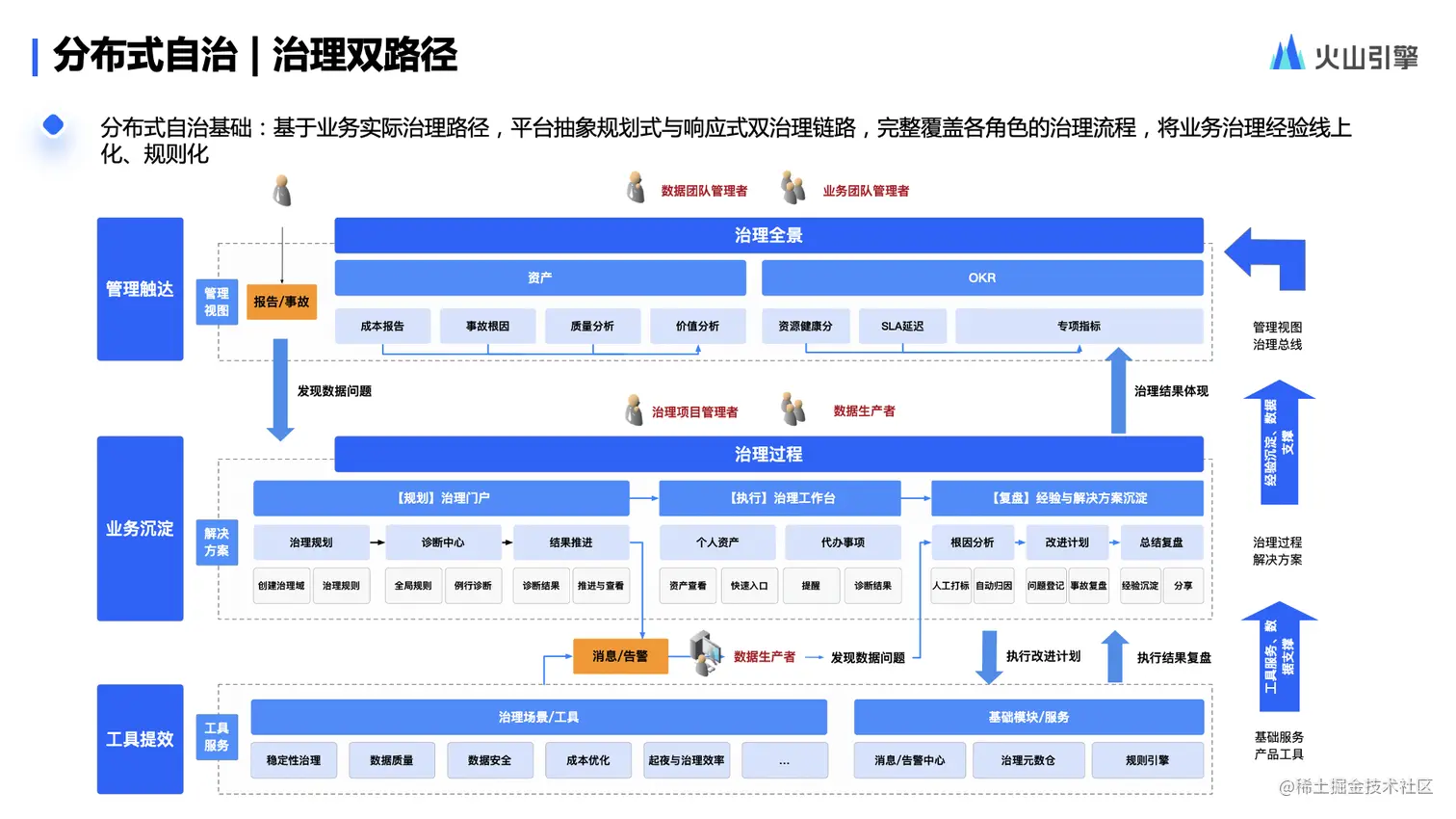 导读:经过十多年的发展, 数据治理 在传统行业以及新兴互联网公司都已经产生落地实践。字节跳动也在探索一种分布式的数据治理方式。本篇内容来源于 火山引擎 超话数据直播活动的回顾,将从以下四个部分展开分享:
