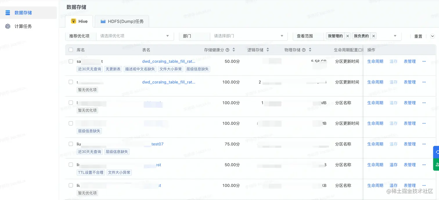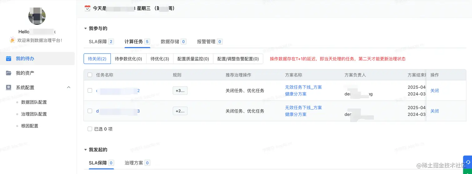 上图为个人工作台功能,主要为了把SLA保障、计算任务、数据存储等治理场景展示在一个页面,方便 owner 业务全局查看治理待办事项。